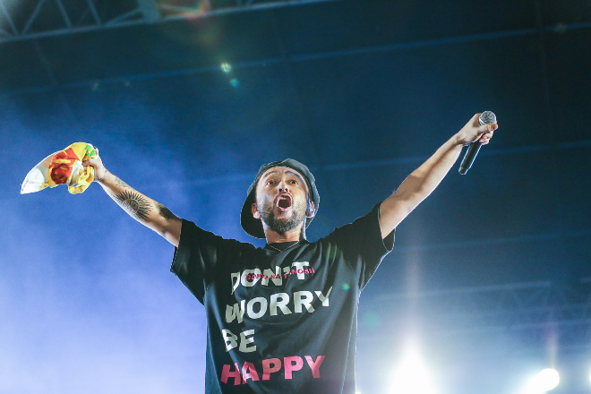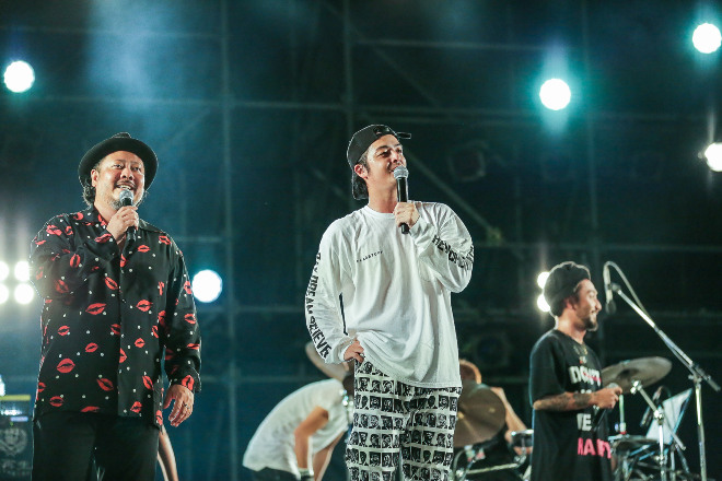 みんなで手をつないで挨拶も決めて、これでホントは終わるはずだったらしい。ところがステージから去り際に、つぶやくように「……アンコール」と言い出したのは清作だった。おまけに「もう、しょうがねぇな。ORANGE RANGEがなにかやるはずよ」と無責任に口にする。それに驚きながらもHIROKIはKiroroの「長い間」を歌い出すが、歌詞があまりにもおぼろげ過ぎた。沖縄県民として、それはあまりに恥ずかしい。そんなこんなで清作が「みんな呼ぼう」と完全にその場の勢いの展開へと突入してしまった。打ち合わせなしで始まったのはORANGE RANGEとMONGOL800のコラボ状態で「DON’T WORRY BE HAPPY」。そこにWANIMAなど、まだそれほど酔っ払いモードに突入していなかったミュージシャンらがゾクゾクと加わる。開演前は大雨でどうなるかと思われた1日目だったが、終わってみれば、ここにいる全員が想像以上の楽しさと興奮でハジけまくる<What a Wonderful World!!18>になった。