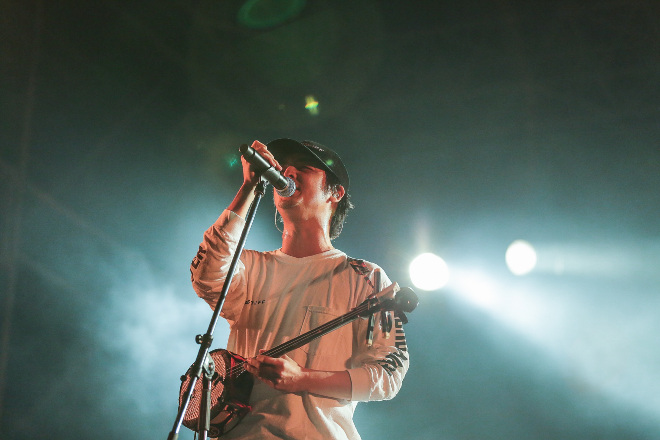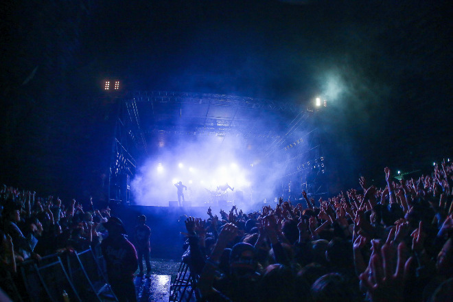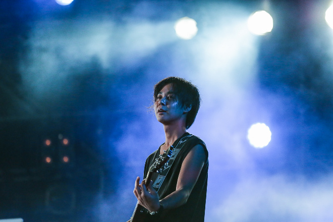 お祭りテクノとも呼べるオープニングSEに合わせてライトが激しく光り、ステージに登場するメンバーをシルエット状に浮かび上がらせる。ハイハットを合図に「上海ハニー」から始まったライブは、のっけからクライマックスと思える一体感と熱さが客席エリアに広がる。それでもHIROKI、YAMATO、RYOの3MCは、リズミカルに言葉を叩きつけながら、さらに煽りを喰らわす。RYOは「一人ひとりのテンションが凄いのは分かった。それをひとつにしなきゃね。沖縄にはカチャーシーというのがあるんですよ」と、沖縄の宴ではおなじみの楽しみ方を伝授。3MCの動きを見よう見まねで手を振れば、モッシュや暴れるのとはまた違った楽しさがマックス状態だ。最新アルバム『ELEVEN PIECE』からの「Ryukyu Wind」が続けば、力強さと勇気も湧くリリックで、オーディエンスはさらに鼓舞されるばかり。と思えば再びキラー・チューンの「*〜アスタリスク〜」で、ORANGE RANGEはロックのチャンプルーぶりを炸裂。刺激の詰まった曲とステージは、このバンドの専売特許と呼べるだろう。