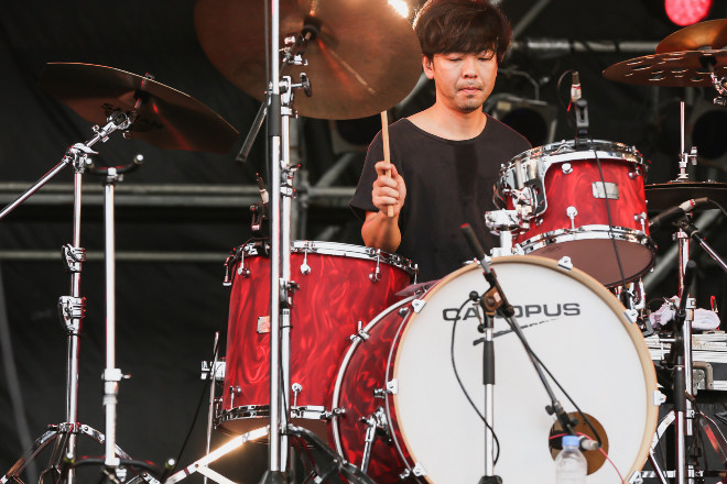 その盛り上がった空気をさらに上昇させたのは、彼らのセルフタイトルを冠した1stアルバム表題曲「山嵐」。そう言えば、今日も会場に1stアルバムのジャケがデザインされたTシャツを来ていた人を複数見かけた。武史がKORN譲りの不穏なベースをじっくり爪弾くと、会場のあちこちで興奮気味の奇声が上がり、曲が始まるや観客も大暴れ。その様子をステージ袖で清作(MONGOL800)が嬉しそうに眺める姿も目に入った。
