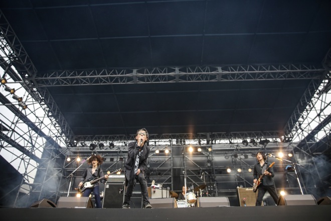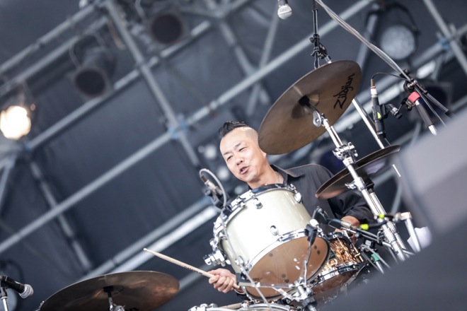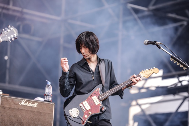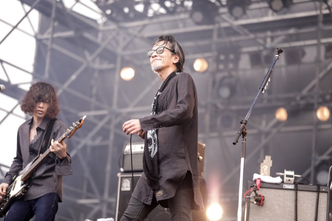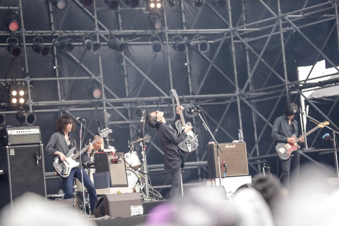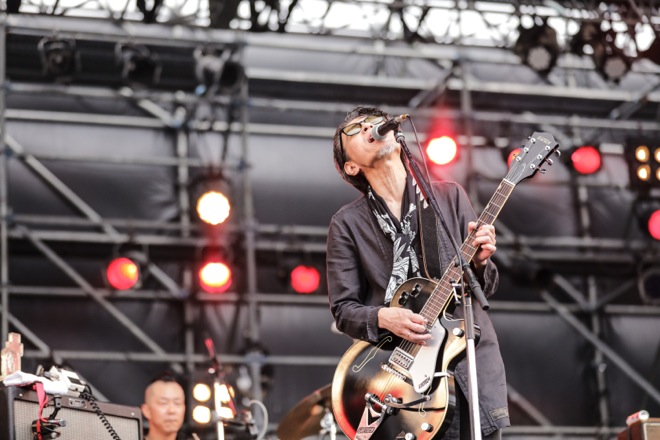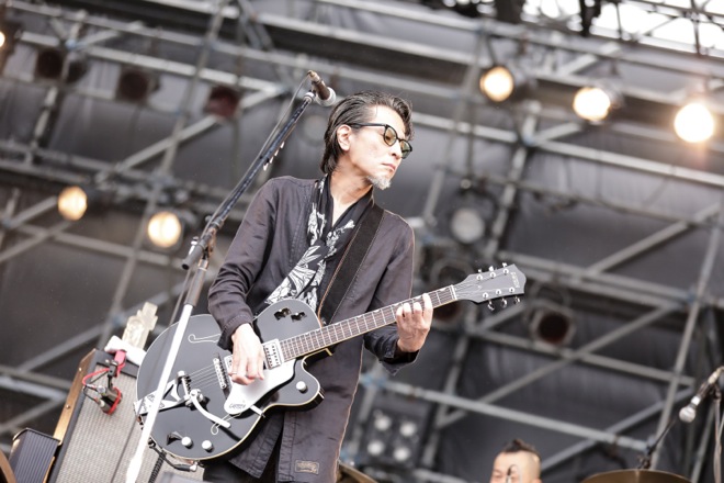 後半はそのヒリッヒリがさらに加速。「24時」「TWENTY FOUR」では、チバはギターを置いてマイク片手にステージ先端で、煽るように声を響かせる。「24時」では、ロカビリー風の威勢のいいギターと、裏路地の一触即発的なヤバい空気を映したドラム&ベースで、真昼間であることを忘れさせるスリリングな夜の匂いを立ち上らせる。鋭いエッジのギターとビートで混沌をドライヴする「TWENTY FOUR」では、チバのハーモニカが饒舌さを増して、観客の興奮のメーターをどんどんとあげていった。