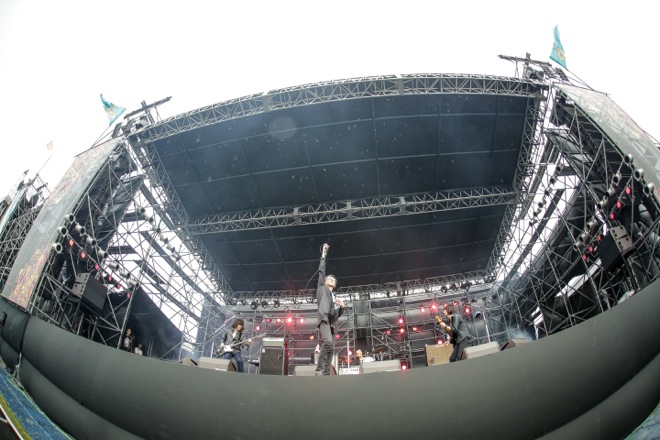 「どうも、The Birthdayです。(雨が)降ったり止んだりで。カッパが多いね」とクハラ。頭上で爆音を響かせて飛んでいく飛行機をチバは指差したりするものの、フェスにちなんだトークや、なにか気の利いたコメントをするなどといったものは特になし。