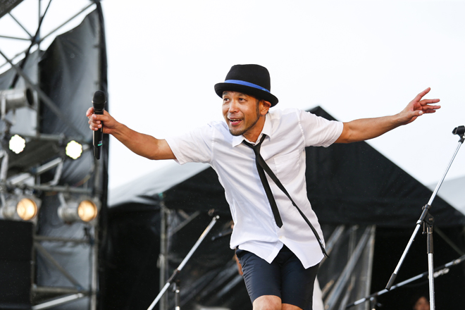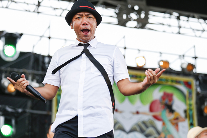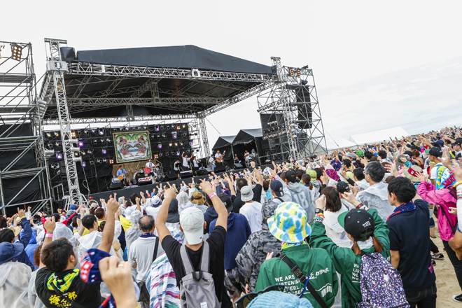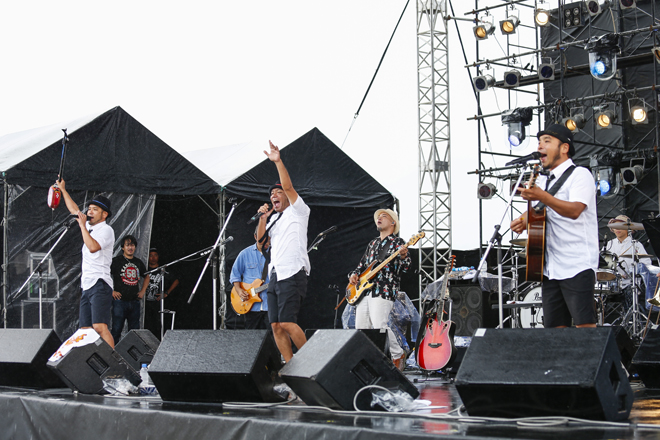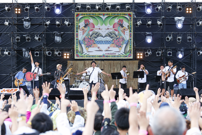 そんな笑いを随所に挟み込みつつ、南米サウンドに八重山地方の方言による歌詞を乗せた「ドゥマンギテ」、マストがアコースティック・ギターでブギウギを奏でる「じんがねーらん(※お金がない、という意味)」に続き、かりゆし58のパンチのあるバンド・サウンドをフィーチャーして演奏された「ゆーしったい(※ざまあみろ、という意味)」は、ファンク感溢れつつ、“ハイサイ”のコール&レスポンスが繰り広げられ、まるで南国のハッピーな要素がすべて詰まった“駄菓子屋”のような楽しいステージであった。