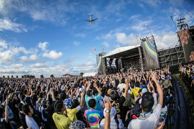 この前フリで始まる曲は、もちろん、「世界はそれを愛と呼ぶんだぜ」だ。会場は大合唱となり、そこに那覇空港への着陸態勢に入ったジェット機の轟音まで加わってきた。