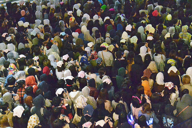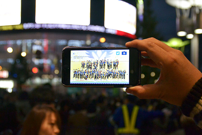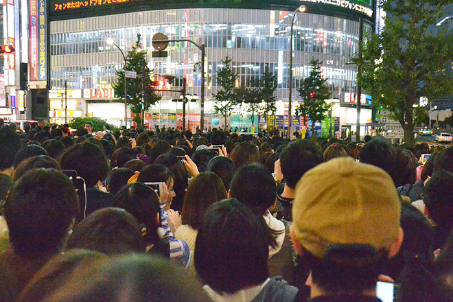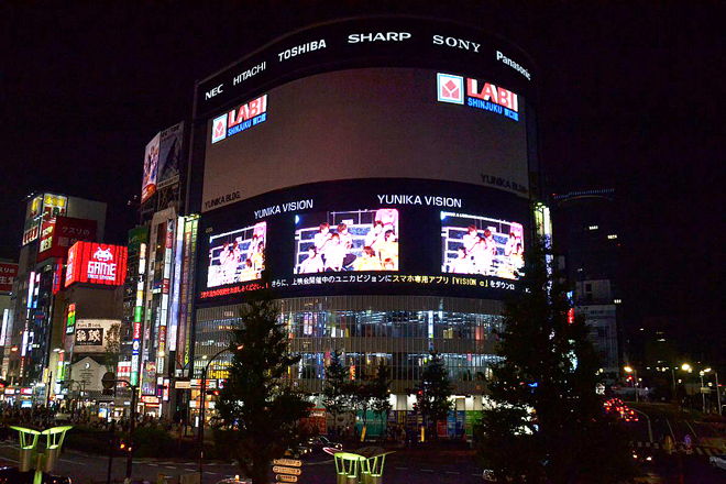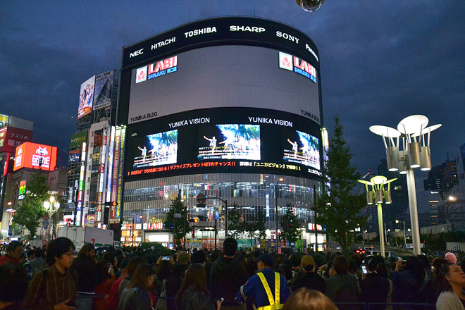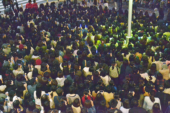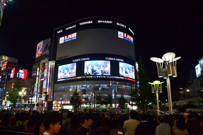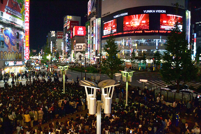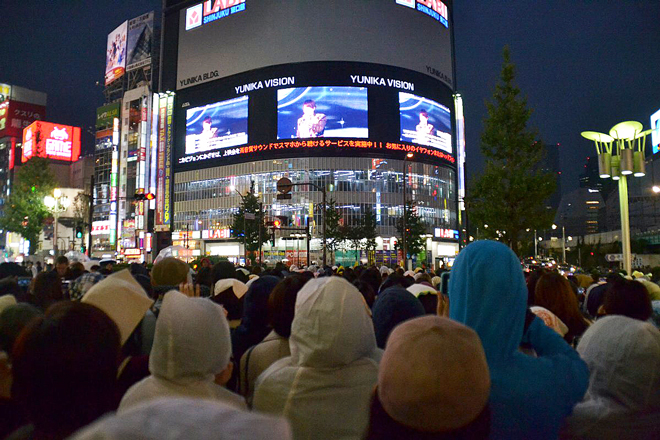 総勢46人のキャストと観客が一体になった熱気あふれる壮大なステージをどこよりも早く、しかも高音質の大画面で見ることが出来るとあって、上映会場となるユニカビジョンを望む西武新宿駅前ペペ広場には大勢の「プロデューサー」(アイドルマスターのプレイヤー・ファンの総称)が集結。週末の夕方ということもあって、駅を行きかう人たちも多く、かなりの人でごった返した。
