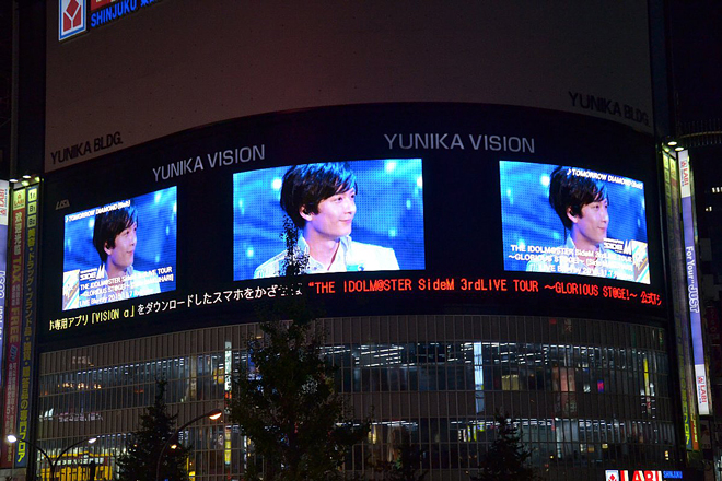 2018年11月3日(土)4日(日)の2日間、数多くのアーティストの上映会が開催されていることで注目を集めている東京・西武新宿駅前のユニカビジョンで、『THE IDOLM@STER SideM 3rdLIVE TOUR ~GLORIOUS ST@GE!~ スペシャル上映会』が行われ、2日間共に多数の観客が詰めかけ、ライヴ会場さながらの大盛況となった。