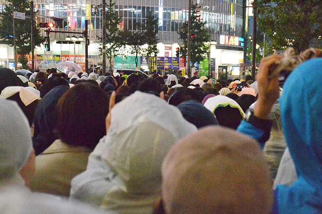 あいにくの曇り空となった新宿ペペ広場周辺。気温も低く小雨も降りかなり肌寒かったが、レインコートを着込むなどして、開始前の時点で、すでに初日以上のお客さんが集まっていた。