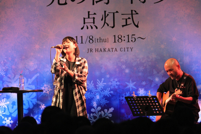 ライブでは一曲目に「みんなと一緒に歌える歌を!」と、代表曲「にじいろ」を歌唱。2曲目には現在先行配信中の新曲「あいことば」をギター一本のアコースティックバージョンで歌い上げ、博多のクリスマスムードを盛り上げた。ライブ後には「イルミネーションの中で歌うことは滅多に無いので本当にステキな時間を過ごさせてもらいました。ありがとう!」とステージを後にした。