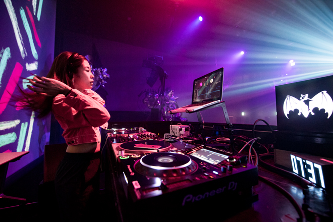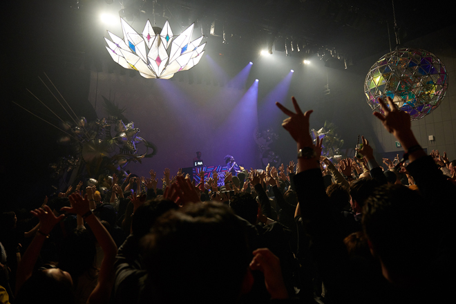 イベント名“Over The Border”からも分かるように、本イベントは“既存の概念を超えた”をコンセプトに、音楽やアートの分野において、既成概念を刷新する表現に挑戦し続ける国内外の気鋭アーティストたちを招聘している。それもあってか、会場を訪れたのは、最新の音楽やアートに敏感なファッショナブルな人々が多かった。エントランスの先にはアート作品を多く展示したギャラリー・スペースがあり、グラフィック・デザイナーのKOSUKE KAWAMURAやUKのアーティストであるJoe Cruz、Hiroyasu Tsuri a.k.a. TWOONEらのストリート感覚に溢れた作品が飾られた。同スペースにはDJブースも併設されDJ SARASAやYOSA&TAAR、Lil Mofoらが登場、さまざまなダンス・ミュージックでギャラリー・スペースを彩った。