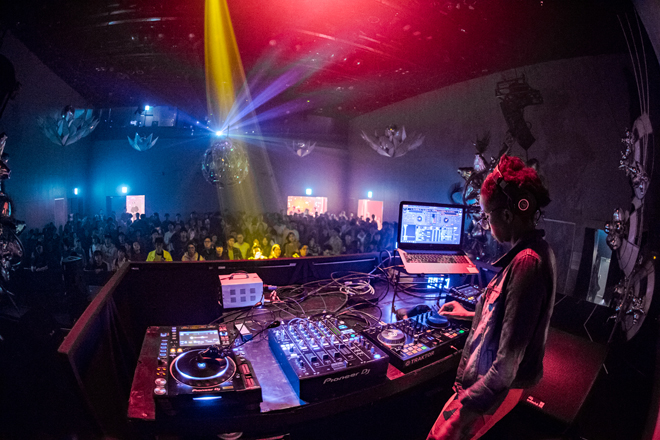 続いてステージを踏んだKampireは、現在注目を集める東アフリカのダンス・ミュージック・シーンの新勢力Nyege Nyegeのコアメンバーでもある女性DJだ。アフリカの音楽シーンの普及にも尽力するKampireは、レゲトンや4つ打ちをベース・ミュージックの視点でまとめあげたような個性的なミックスを披露。途中でさらにBPMを上げアッパーなトラックをプレイすると、さながらフロアはお祭り騒ぎとなった。