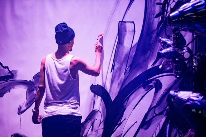 さらにもうワンフロア上へとエスカレーターを登り、ホールの扉をくぐると、ミュージシャンのパフォーマンスが繰り広げられるスペースとなっていた。R領域が装飾を施した近未来的なステージには、まず女性DJのYukibebが登場。LAを拠点とするSOULECTIONに所属する唯一の日本人メンバーである彼女は、90sクラシックから近年までのヒップホップやR&Bを巧みにミックスしてフロアを暖める。続いてステージに上がったのは7インチをミックスするDJ KOCO a.k.a. Shokitaとグラフィック・アーティストのJUN INOUEによるライブペインティング・パフォーマンス。DJ KOCOが紡ぐアップテンポなブレイクビーツに合わせて、およそ4〜5メートルの広大なキャンバスに黒のラインを躍動させ、立体感漲る作品をおよそ1時間という時間で完成させると、会場からは大きな拍手が湧きおこった。