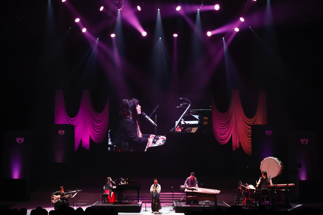 鈴華ゆう子が詩吟、歌、ピアノ、 尺八に神永大輔、 二十五絃箏にいぶくろ聖志、和太鼓に黒流、ギターに町屋(和楽器バンド)という豪華なバンド構成でライブが行われた。「星降る丘」など、 鈴華の透き通り響く歌声に二十五絃箏と尺八が重なり、冒頭から観客を釘づけにした。
