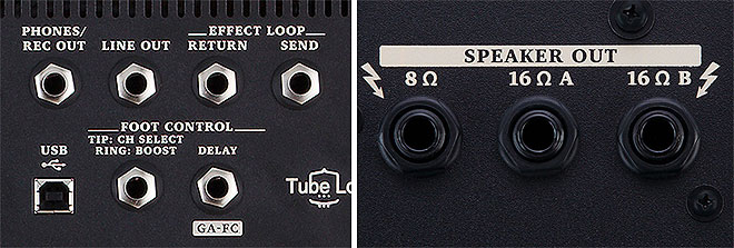 ▲外部エフェクター接続用のエフェクトループも備えたリアパネルの入出力端子(左)。スピーカー・アウト(右)は8オームに加え16オームのキャビネット2台までの接続に対応。