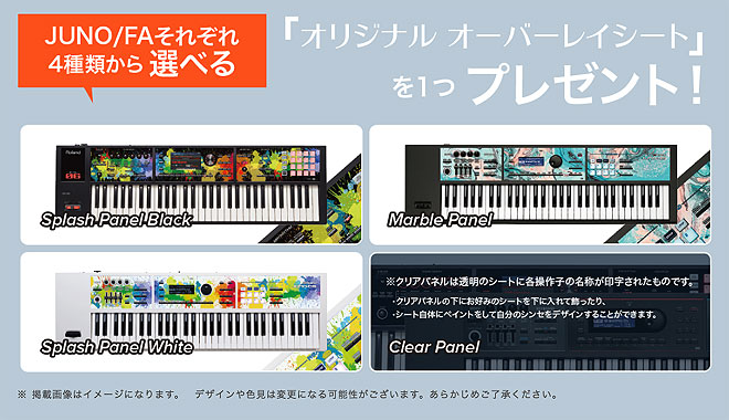 この冬ローランドのシンセサイザーをお得に購入するチャンス! JUNO/FAシリーズの購入者にキャリングケース、自分のシンセにオリジナリティが出せるオーバーレイシートをプレゼントするキャンペーンが11月17日(土)よりスタートする。