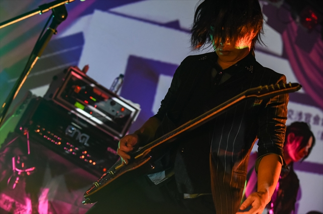 紗幕が取り払われ、ネロ(Dr)のカウントから勢い良く始まったのは「夜光」。結生(G)のループするギターフレーズがサウンドの中心を担い、出口のない真っ暗な世界の中でもがく心をガラが唄う。ガラの震えた声が高く伸びるこの曲では、MERRYという個性を色濃く臭わせた。間髪入れずに届けられた「犬型真性MASOCHIST」では、空虚に響く鐘の音を切り裂くようにイントロのサウンドが攻める上に、普段は“支配されたくない”と唄う彼らが、ここでは“支配されたい”と懇願する。この矛盾と歪みにこそ、“絶対”とは言い切れない世の中の有り様を突きつけられる気がした。音数を減らし、ネロのバスドラだけで唄われる後半の見せ場では、この曲の刹那をより引き出していたようだった。