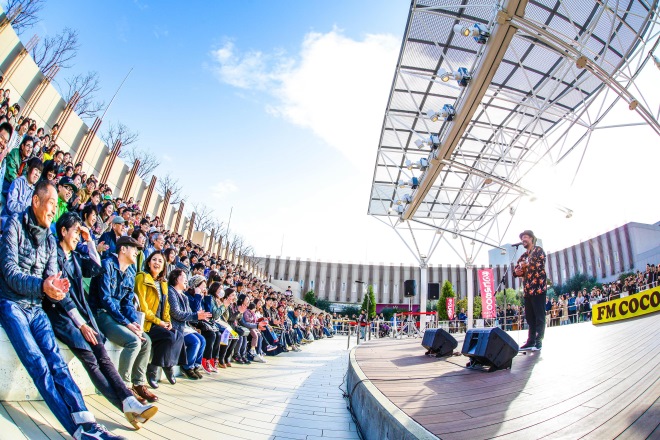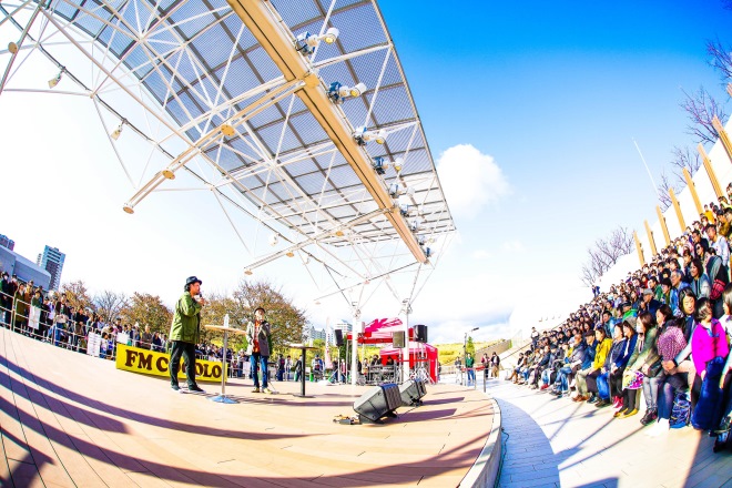 このイベントは、マーキーがDJを務める『SUNDAY MARK’E 765』と、MONGOL800の結成20周年を記念してオンエア中の『THE MUSIC OF NOTE~MONGOL800モンパチハタチ』という、日曜放送の2番組が合同で行なったもの。開業10周年を迎える阪急西宮ガーデンズの開放感溢れる屋上庭園には約700人のリスナーが集まり、マーキーとキヨサクの和やかなトークやライブを楽しんだ。