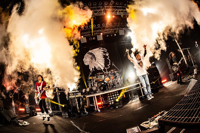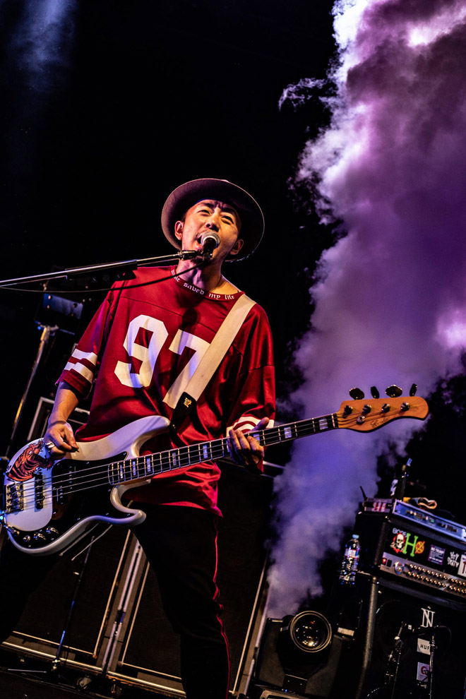 ヘヴィなグルーヴ感で攻める「Revolution」を挟むと、ここからまた最新作『WOKE』収録ナンバーを畳み掛ける。エッジ際立つリフが冴え渡る「Rude Boy」、パンキッシュな疾走感に満ちた「Nice to meet you」、ラップを用いたヘヴィロック調の「Code name」、メランコリーなエモーションを運ぶ「Kings work」など、どの楽曲も即効性に長けたライブ感を叩き付けてくる。また、煌々とミラーボールが回る中、The BONEZにとっては新境地とも言える「LIFE」が始まると、多幸感に満ち溢れた空気が会場の四隅に広がっていく。再び「Louder」、「Adam&Eve」とアッパーな楽曲を放った後、メンバーが一人ずつ長めのMCで胸の内を述べていった。