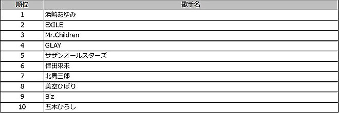平成で最も歌われた歌手は“平成の歌姫”こと浜崎あゆみ。誰もが知る人気曲が多いだけに納得の結果だ。続く2位はEXILE、3位はMr.Childrenと男性グループがランクイン。また、“昭和の歌姫”こと美空ひばりは8位にランクインしている。