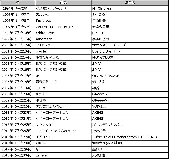 ■年別ランキング1位楽曲 1994年~2018年