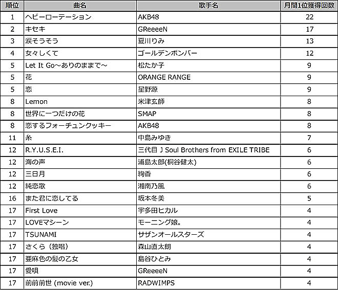 1994年(平成6年)から2018年(平成30年)の間で、月間ランキング1位になった回数の多い上位曲を抽出。1位に輝いたのは、AKB48「ヘビーローテーション」で、月間1位を22回も獲得。GReeeeN「キセキ」の17回、夏川りみ「涙そうそう」の13回、ゴールデンボンバー「女々しくて」の12回がそれに続く。