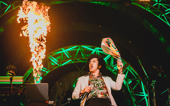 激しいラテンのリズムのイントロから入ったのは、ツアータイトルにもなった「Boom!Boom!ヘブン」だ。メンバーの後方では、6本の火柱が曲に合わせ吹き上がる。このNHKホールの会場でしか見ることができない炎の演出に、会場全体でタオルをブンブン振り回し、この日一番の盛り上がりをみせた。