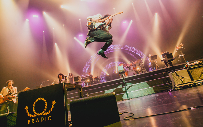 会場のSEが鳴り止むと大歓声があがり、コーラス・ホーン隊が奏でる「Funky Kitchen」から幕が開ける。メンバーが登場すると満員のNHKホールから歓声と拍手が巻き起こり、ステージ背後には煌びやかな電飾が施されたBRADIOロゴのオブジェが登場。ボーカル・真行寺が「会いたかったぜー!」と叫び、ライブはスタートした。