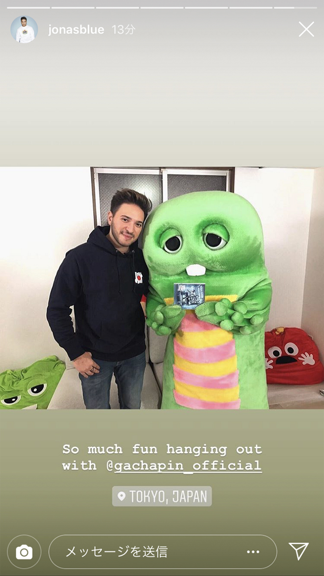 11月9日にリリースされたデビュー・スタジオ・アルバム『ブルー』のプロモーションのため来日中のジョナス・ブルー。26日にInstagramのストーリーズにアップされたのは、アルバムを手にしたガチャピンとの記念写真だ。ガチャピンは現在YouTuberとしての活動も行っており、今回公開された写真はその撮影スタジオを訪問した際のものとみられる。ジョナスは日本の国民的人気キャラクター・ガチャピンとの出会いに、「日本一のレジェンドな恐竜に会えてとても光栄だよ!」と興奮気味に語ったとのことだ。