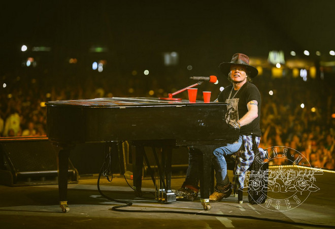 開演前の数時間、吐き続けていたというアクセルは、点滴や注射を受けステージに立ち、通常より10曲ほど少ない17曲をプレイしたところで、パフォーマンスを終えた。