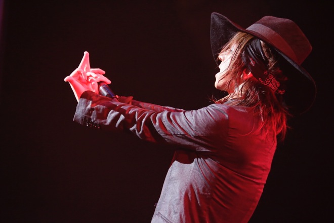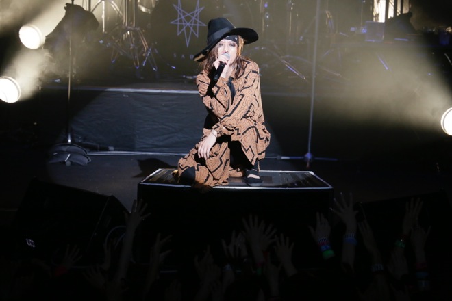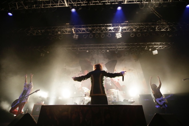 K-A-Zが巧みなテクニックで情緒たっぷりのギターソロを奏でると、本編は中盤へと突入。清春が妖しく淫らに観衆を扇動する「GOTHIC CIRCUS」の後、「HONEY」「Hate」といった甘く邪悪な轟音が続く流れなどは、聴覚的にも視覚的にもワクワクさせてくれる。