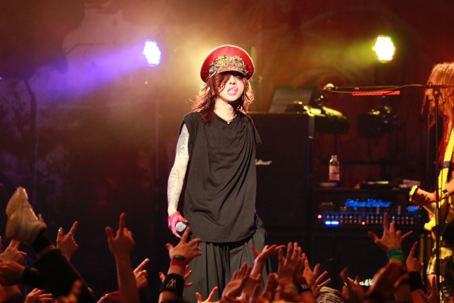 GOが渾身のドラムソロで観客を熱気まみれにすると、本編はいよいよ終盤へ。「GIRL IN RED」「MAKING MOTHER FUCKER」「NIGHTMARE」などの過激な楽曲が連発されると、オーディエンスは当然のごとく、揉みくちゃ状態に。ここから清春が天性のカリスマを発揮する「Because」へと到達すると、本編は狂乱のうちに幕を閉じた。