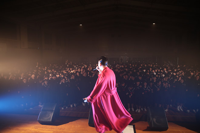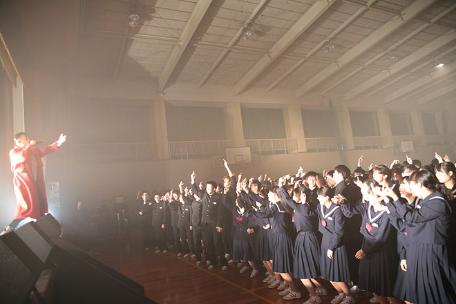 ライブ中には、「一年生の学年主任の先生はオレの剣道の後輩なんです。先生が調子に乗ったらオレに言え(笑)。うそ、みんなちゃんと言うこと聞いて」と先輩ならではのトークで会場を温め、「ムカつくことあるでしょ。正常です。いまはムカつくこと、音楽の時間で発散していくんです。体育館の屋根に向かって中指、突き立てろ」と煽りながらも「過激な歌うたってすみません」など母校パフォーマンスならではのコメントも飛び出す。