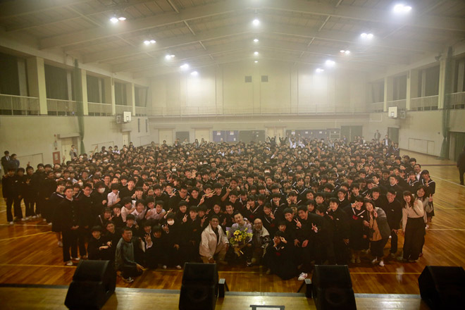 その後、校歌をアカペラで生徒とともに合唱。生徒の代表2人から「ぼくたちも武士さん(AK-69本名)のようにがんばっていきたい」というメッセージとともに花束が贈呈され、全員で記念撮影を行ないイベントが終了した。