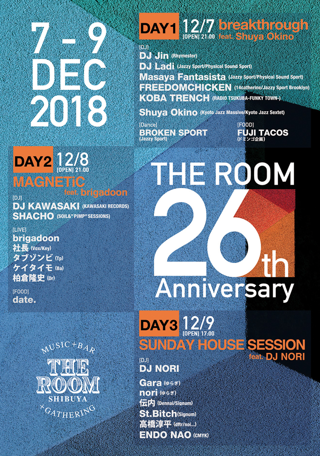 The Roomは、選曲家・沖野修也がオーナーを務める渋谷の“TAMARIBA”。渋谷は桜丘町にて、大沢伸一やbirdらが“卒業”し、DJ KAWASAKI、NAYUTAHなど、数多くのアーティストを輩出し、良質の音楽を提供してきた。