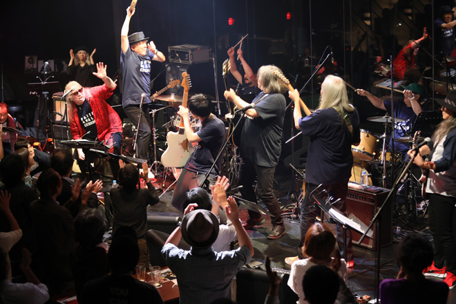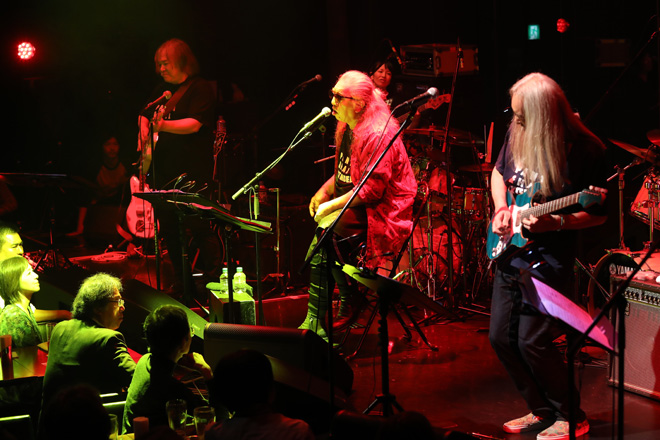 そしてフィナーレは全員がステージに登場しての「マラッカ」。4人による圧巻のギター・ソロが続き、客席は総立ちで盛り上がる。そんな動きに促されPANTAも久々にスタンディング・シャウトだ。