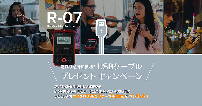 12月8日(土)からは、「R-07」の購入者を対象としたキャンペーンがスタート。期間中の製品購入で、「R-07」で収録した音声データをPCにバックアップする際にあると便利なマイクロUSB 2.0ケーブルをプレゼントする。