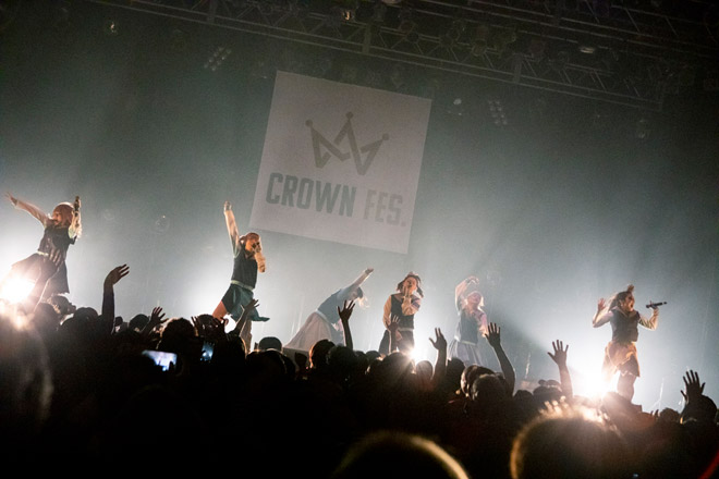 フェスのラストを飾ったのは、今や日本国内だけでなく、海外でも確かな人気を獲得し、ワールドワイドに活躍するメイドによるハードロックバンド・BAND-MAID。「クラウンフェス、声出せるよな!」という彩姫(Vo)の攻撃的な煽りとともにお給仕(ライブ)がスタートし、重厚なロックサウンドとテクニカルな演奏で観客を巻き込み、O-EASTをフェスティバル会場と変貌させる。ラストは、“世界征服”がテーマの楽曲「DOMINATION」で観客を圧倒。レーベルの隆盛をロックで祈願し、クラウン初の主催フェスを締めくくった。