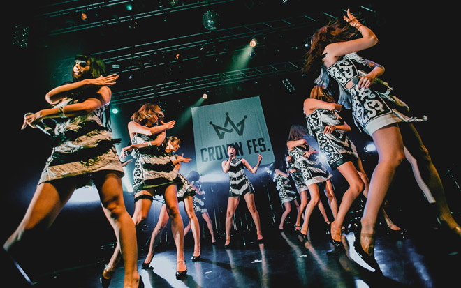 女性アーティストのトップバッターとして登場したのは、現在2グループ制で活動しているBiS2nd。代表曲「BiSBiS」のイントロが流れると会場のボルテージが一気に跳ね上がる。同曲の振付を「C」「R」「O」「W」「N」と人文字で表現したほか、MCでキャプテンのムロパナコがレーベルの象徴である手製の“王冠”を身につけて登場するなど、レーベル愛を全身で表現する場面も。その後、クラウンからリリースした全シングル曲をパフォーマンスして破天荒アイドルとしての存在感をしっかりと示した。