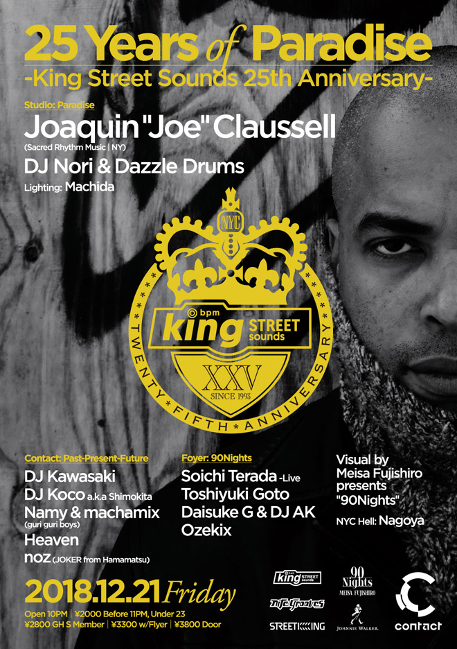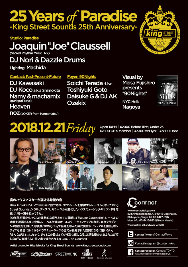 盛り上がりに貢献したのが、ジョー・クラウゼルだ。「素晴らしい音楽による25年を祝う、重要でとても特別な日にHisaから誘われたことを光栄に思う」と語るジョー。日本からはDJ Nori、Soichi Terada、DJ KAWASAKIら、日本から世界へ向けてダンスミュージックを発信してきたDJたちが華を添える。また東京のクラブシーンを記録した写真集「90 Nights」を出版し話題となった藤代冥砂がビジュアルを担当することとなっている。