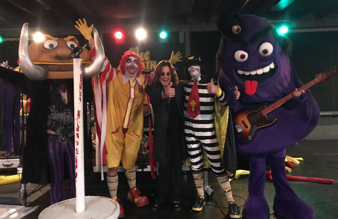 オジー・オズボーンが、息子ジャックと孫娘パールちゃんから“サプライズがある”と連れ出され、マクドナルドをテーマにしたブラック・サバスのトリビュート・バンド、Mac Sabbathのパフォーマンスを観覧した。
