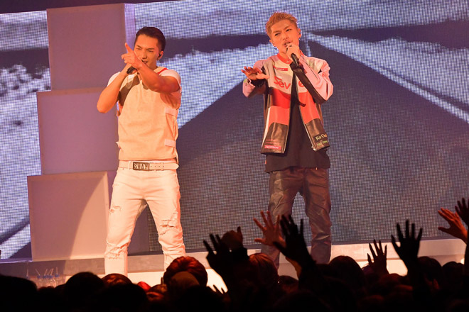 後半では、大人の洗練を感じさせる「Lullaby」や、ラッパーであるSWAYが歌に挑戦した「Acting Myself」などの楽曲でじっくりと聴かせる。そして「Never Say Goodbye」で、SWAYがLDH JAPANに所属するきっかけとなった、北海道時代からの盟友であるEXILE SHOKICHIが登場すると、またしても会場が熱狂に包まれる。二人にとって、こうして共演することはきっと夢のひとつだったのだろう。SHOKICHIが「初めて(この曲を2人で)やったね。でも、やるべきところでやれたんじゃないですか?」というと、SWAYも満面の笑みだ。SWAYは、「レペゼン札幌! 俺たちは北海道から東京をロックしにきているから、気合いが違う」と言い、そのまま2人で「Rock City」を披露した。