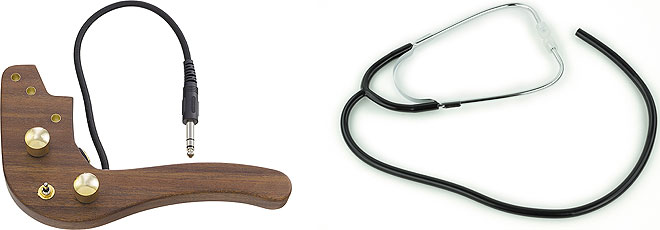 ▲コントロール部分はネジ1本の着脱式ラップレストに。収納時は外して小さくできる(左)。聴診器スタイルのヘッドホンはバッテリーを使用せず、エコなスタイルでアコースティックサウンドを聞くことが可能。