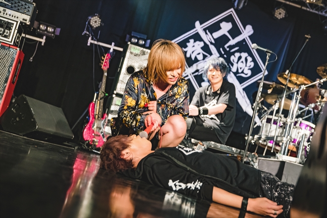 「あと10倍、声出せ! 全力でかかってこい!」という言葉の後には「メンタル≠ヘルプ」が続き、七星(B)の歌うようなベースの音色が観客を魅了していく。リズム隊に関しては昔と比べても音が引き締まったように思う。己に厳しいがゆえに新曲を出す度に音作りにも余念がない。そうした努力があってこそ今日のプレイへと繋がっていくのだろう。次に演奏された「アナタ」では、舞台劇のような演出で曲が進んでいく。