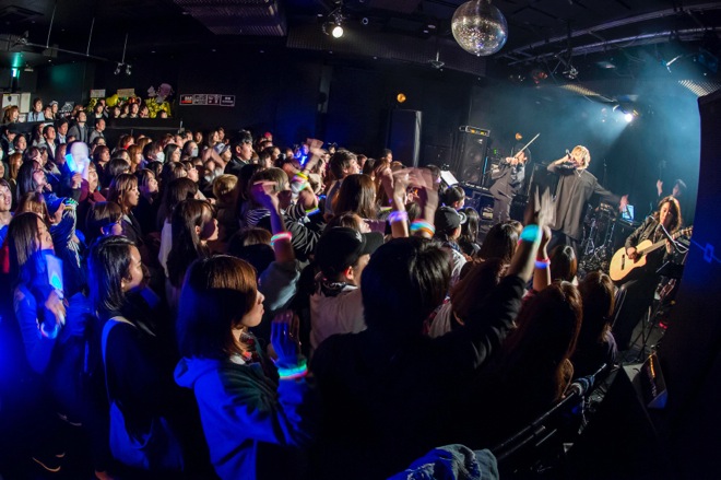 この夜は、彼らのワンマンライブでは初となるバンドスタイル。開演時刻、暗転した場内にオープニングSEが流れ、まずバンドメンバー、そしてTatsuとNatsuがステージへ。最後にFümiが登場すると会場は一気に興奮状態に。デビュー曲の「それでも僕は生きている」でスタートしたライヴは、いきなりの全開チューンに観客もヒートアップ。そのまま、Neruの「かなしみのなみにおぼれる」、Eveの「トーキョーゲットー」とFümiが影響を受けたボカロソングのカバーが立て続けに披露されていく。