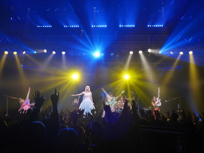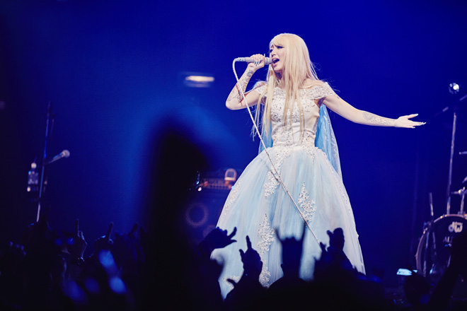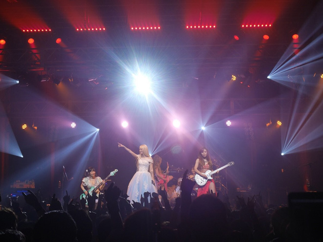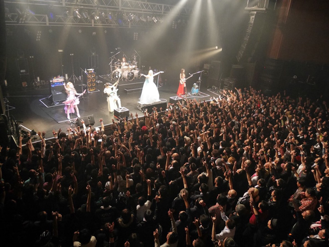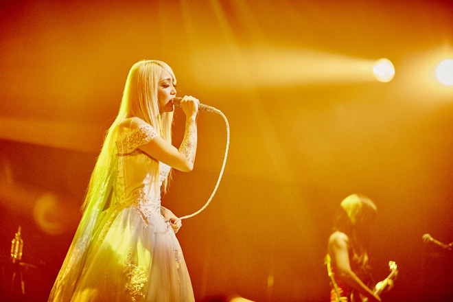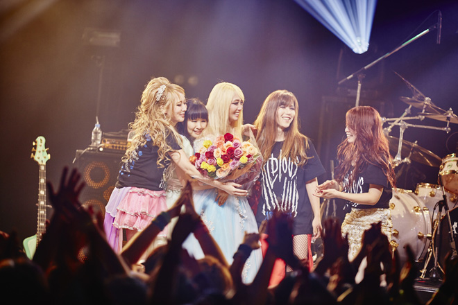 またオーディエンスからの熱を浴びて、テンションをどこまでも高める5人。網タイツの太ももをあらわに、セクシーぶりにさらに磨きをかけたYoshiがリフやメロディを奏で、ピンクのミニスカート・ドレスも刺激的なトキはトリッキーなフレージングをこれでもかと聴かせる。ツインテールで幼さも魅力のサワは、そのイメージから想像もできないほどのヘドバンなど激しい動きを繰り出しながら力強いベースで攻め立てる。義理父のテリー・ボジオ譲りの多点セットをクール・ビューティに叩くのはMarinaだ。そしてRe:NOはファンひとりひとりを見つめながら気持ちを込めて歌い上げていく。