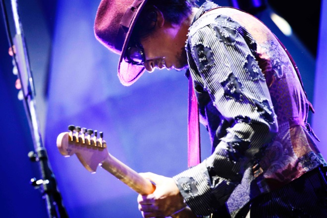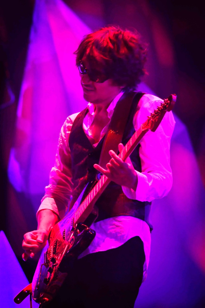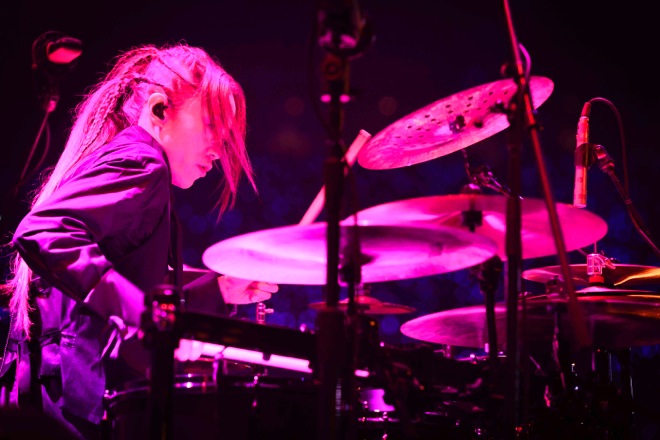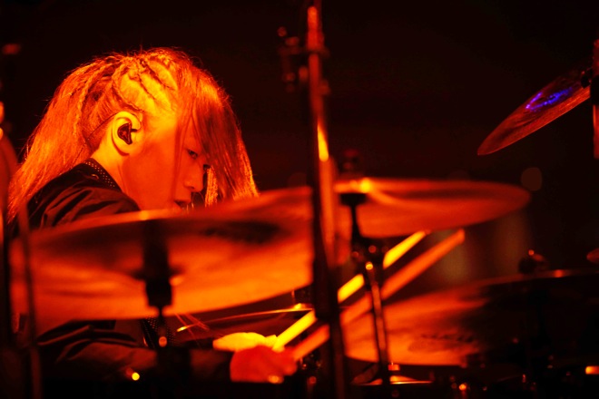 この直後、ken(G)のギターリフで空気は一変。「接吻」が始まると、hydeは帽子を脱いで代わりにサングラスを装着。エッジィなロックンロールを良い意味で荒っぽく鳴らし、妖しく高下するメロディーを退廃的に響かせて、それまでの流れとは全く異なるヘヴィさを見せつけた。続く「fate」は「接吻」の余波を受け、感情の昂ぶりや強さ、切々と問い掛けるような鋭さの際立つパフォーマンスを展開。一音一音が明瞭かつ抑制的なプレイであると同時に、秘めた情熱を感じさせる躍動感に溢れたyukihiro(Dr)のドラミングも効いていた。