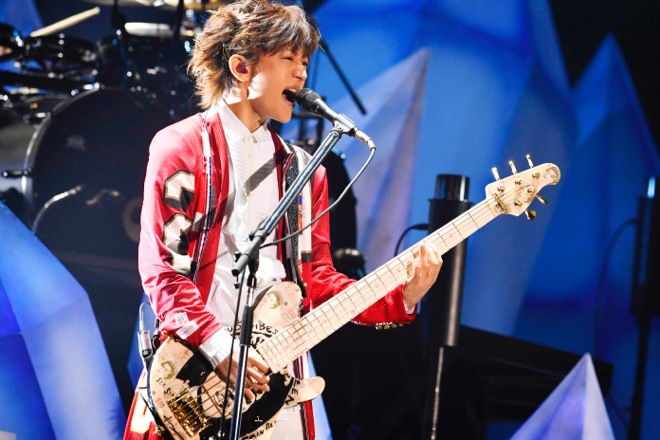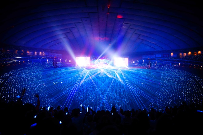 続く「Caress of Venus」ではレーザービームが放射され、心地よさそうにリズムに乗りながら歌い演奏するメンバーの姿に、会場も一層沸き立つ。ミリオンヒット曲「snow drop」でどよめきが起こると、予め観客に配布されていたL’edバンドが点灯。LEDスクリーンに映し出されていた銀世界と会場全体とが地続きの、青の世界に染められていく。