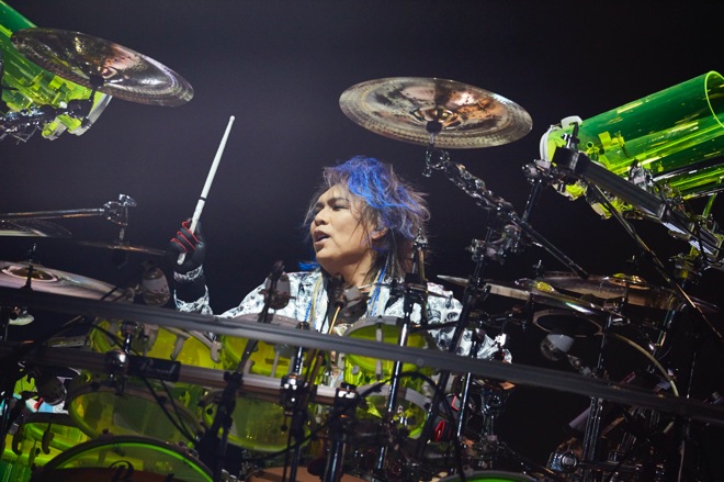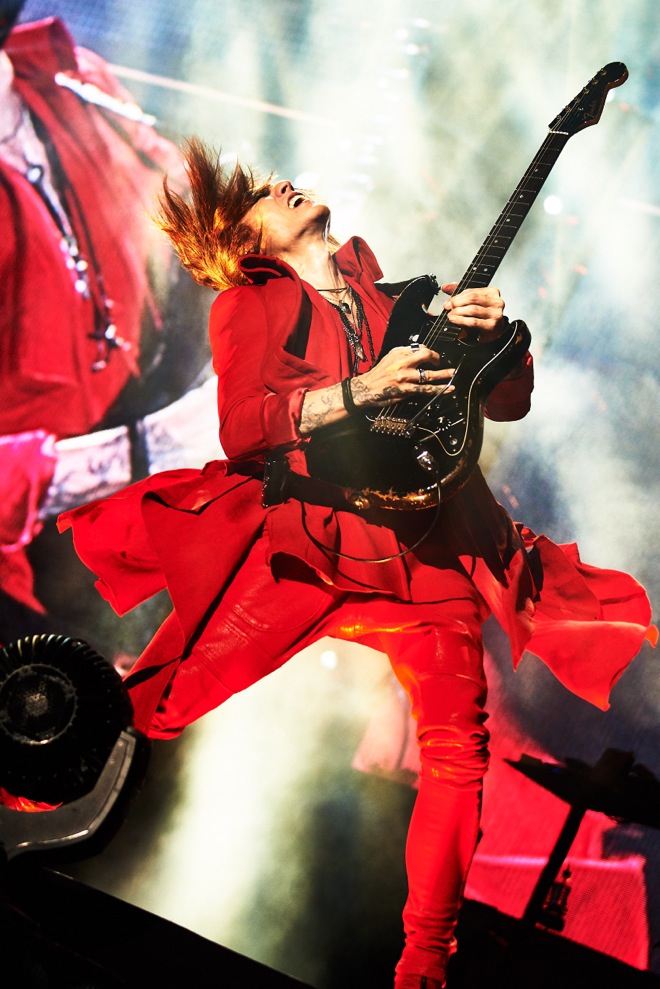 いきなり、「Dejavu」で幕を開け、特攻とともにはじけるアクト。SUGIZOが上手へJが下手スロープへと散り、RYUICHIとINORANが向かい合って大歓声に揺れるさいたまスーパーアリーナ。1曲の中でこれほど多くの見せ場を作るバンドはなかなかいないと思っていると、Jのベースがフィーチャーされるビートのキレが生命線の「MECHANICAL DANCE」を投下。2曲目にして場内は沸騰状態だ。エンディングで真矢のスティックが宙を飛んだ。