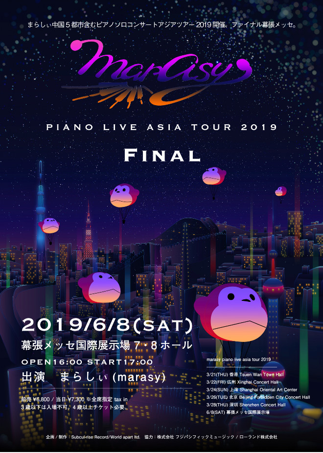 まらしぃのアジアツアー<marasy Piano Live Asia Tour 2019>の開催が発表された。2019年3月に中国5都市を巡り、6月には自身最大規模のコンサート会場となる千葉・幕張メッセでファイナル公演が行われる。