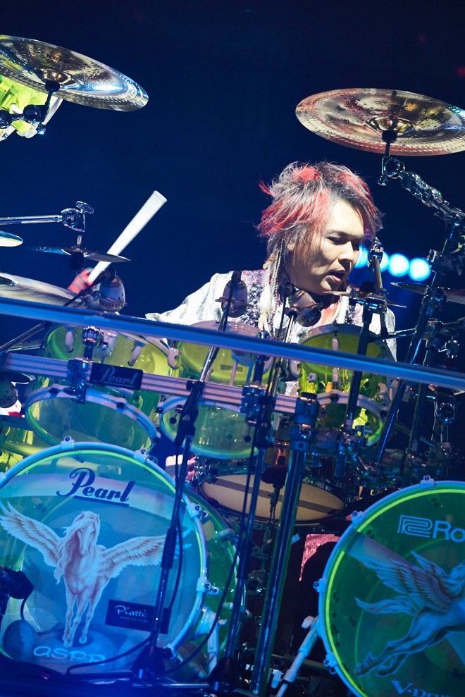 間合いも含めて見せて聴かせる入魂のプレイに息を呑む真矢のドラムソロでは“真矢コール”で場内が一体になり、JはEDMのバックトラックを陵辱するようなワイルドで強靭なベースをかき鳴らし、センターで何度もシャウト。会場をひとりで引っぱっていく強力すぎるリズム隊のセクションをはさんで、インディー時代から演奏され続けてきた「BLUE TRANSPARENCY」を投下するとスーパーアリーナはコール&レスポンスで熱狂の渦だ。SUGIZOとINORANが上手で向かい合い、RYUICHIも絶叫。30年近く演奏されているナンバーが世代を超えて今も見る人の我を失わせること自体が何というか凄すぎる。