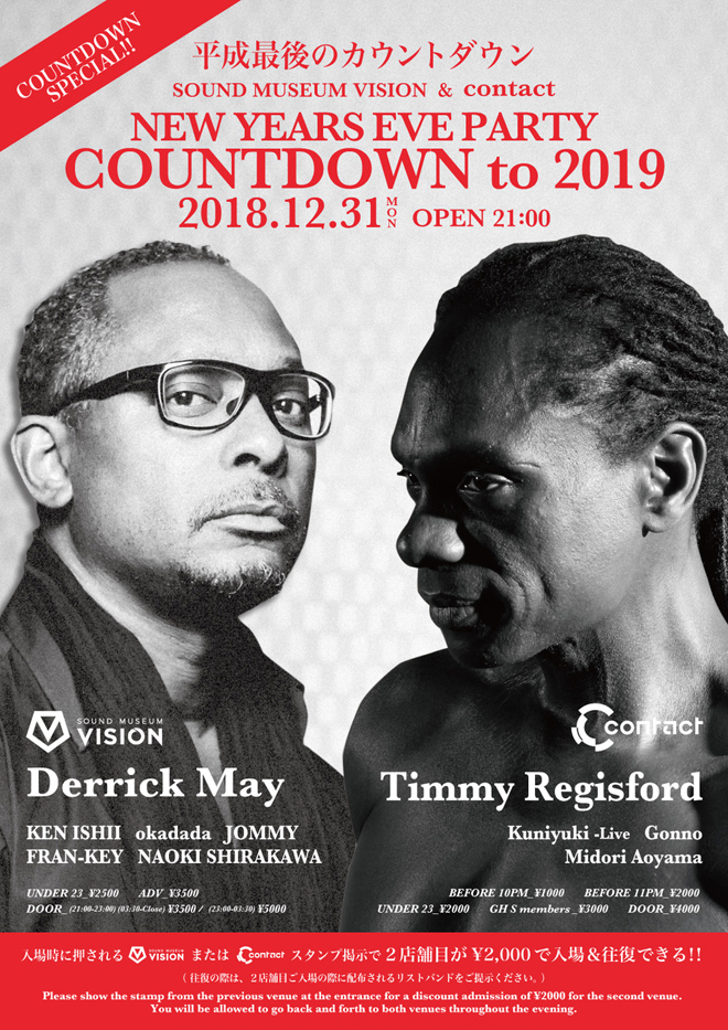 そして今年、平成最後と言うメモリアルなカウントダウンを演出するため、デリック・メイが渋谷SOUND MUSEUM VISIONに帰還する。この素晴らしいニュースは、日本人だけでなく、カウントダウンに渋谷に集まる世界中の人々達を歓喜させるものであり、カウントダウンを感動の渦に巻き込む一夜になることを約束されたと同意義であろう。平成最後のメモリアルなカウントダウンをぜひ心待ちいただきたい。