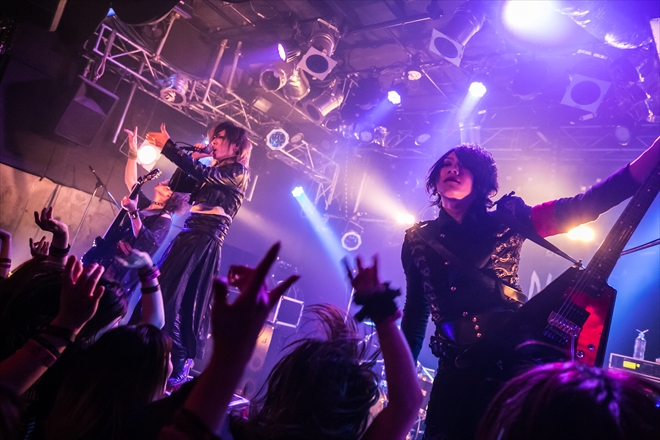 結論から言うと、1年で特にyagami(Vo)の存在感が強くなったと感じた。鬼をテーマにしているMEIDARAだが、“演じている”感は一切ナシに、ステージに上がってきた瞬間からメンバーは“人と鬼の狭間”に見えた。そうして彼らの名刺代わりの一曲「鬼火」から、ステージをMEIDARA色に染め上げた。